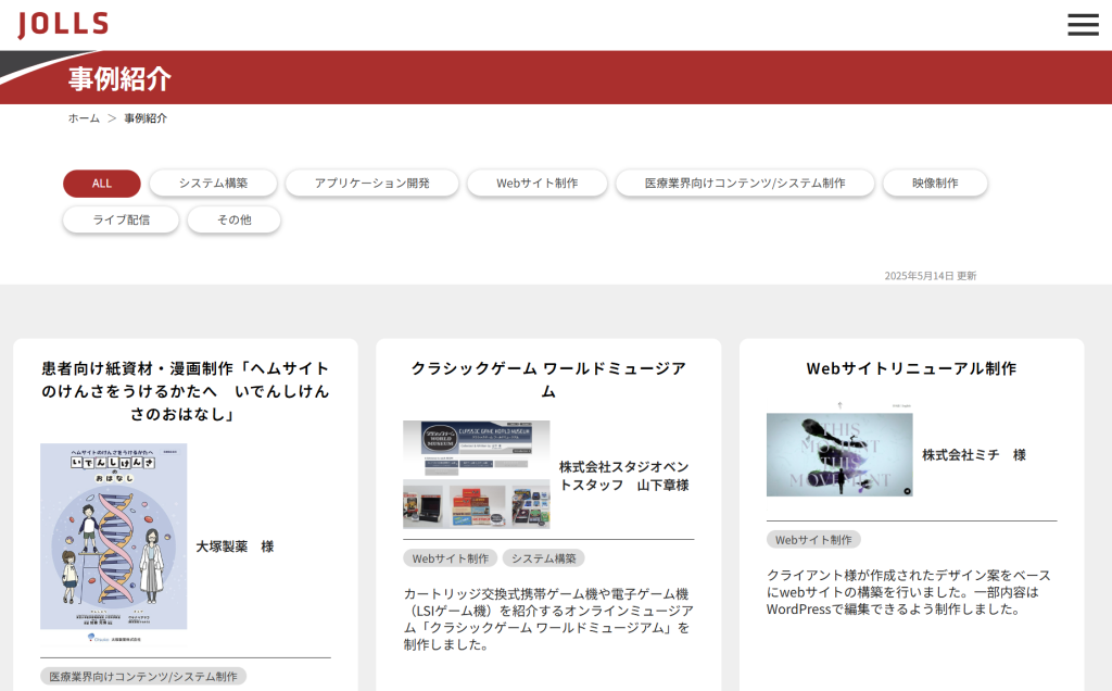 事例紹介ページに「10周年記念イベント用ビデオ制作」、「教育コンテンツサイト制作」、「適合検索システム開発」を追加しました